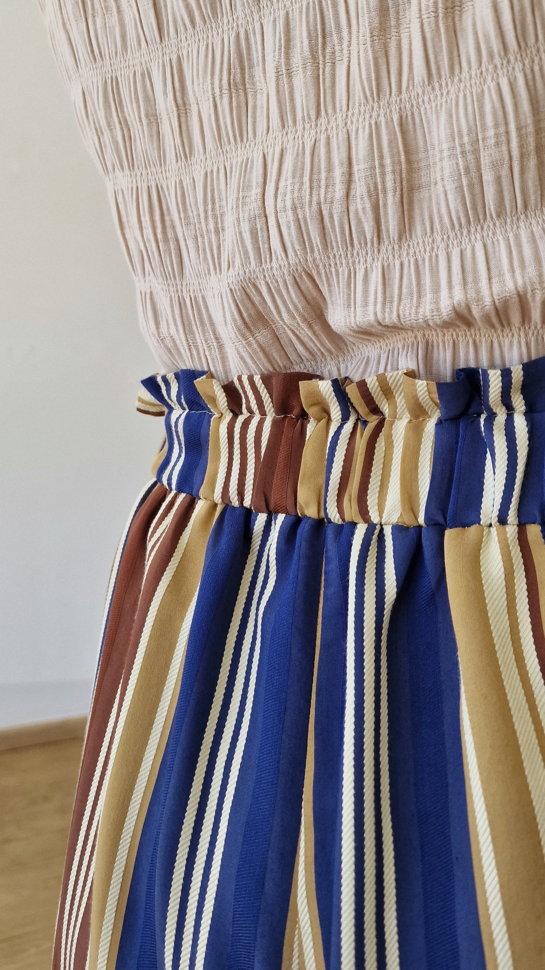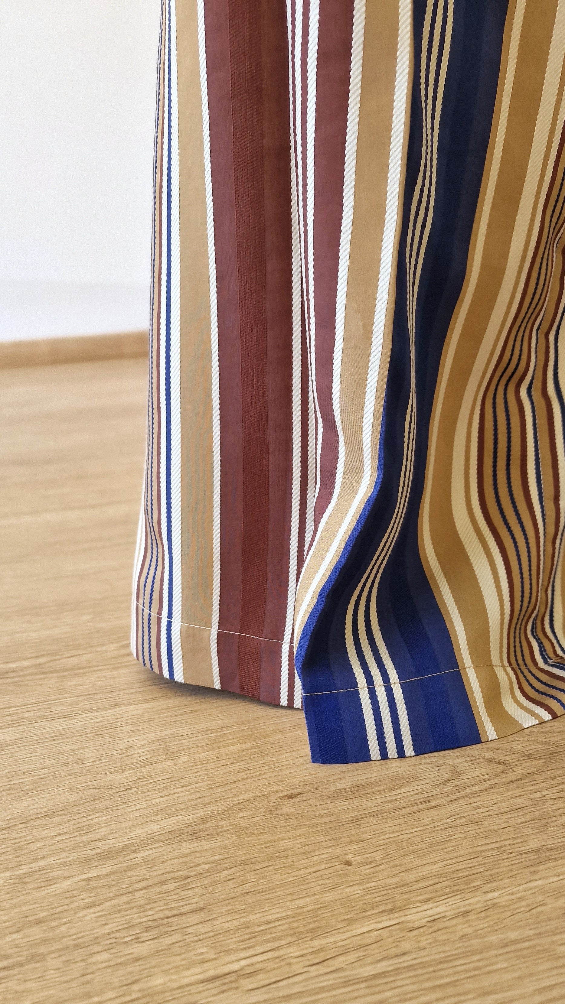 - Pantalonas com padrão de riscas verticais em tons quentes e contrastantes — desenhadas para alongar a silhueta e dar personalidade ao look.