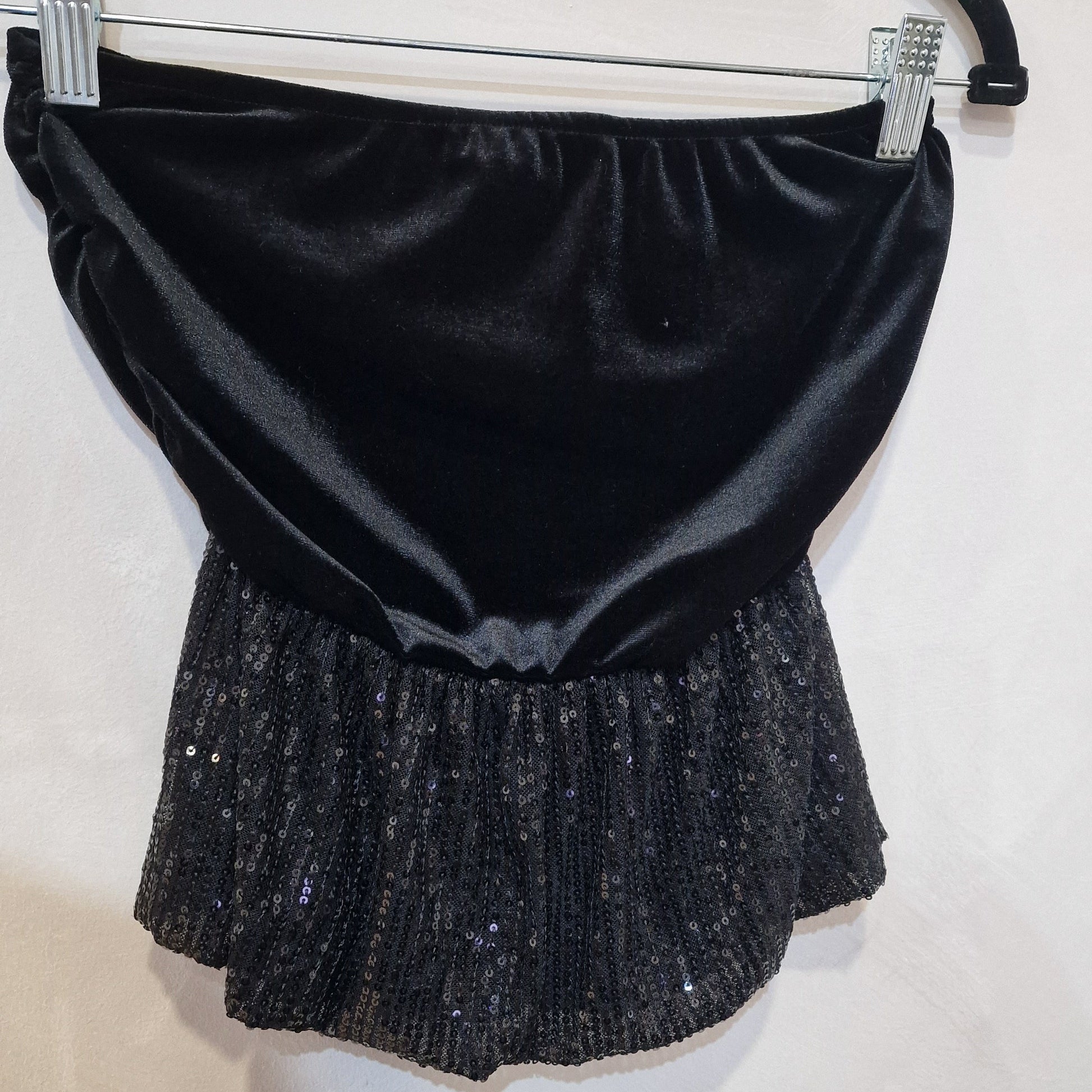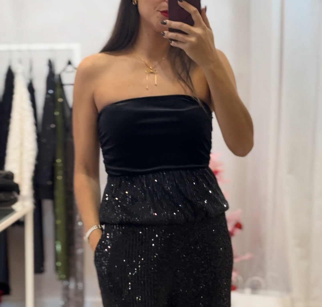 Top bandeau em veludo elástico com aplicação de lantejoulas na zona inferior. Estrutura justa, elegante e pensada para looks de noite.