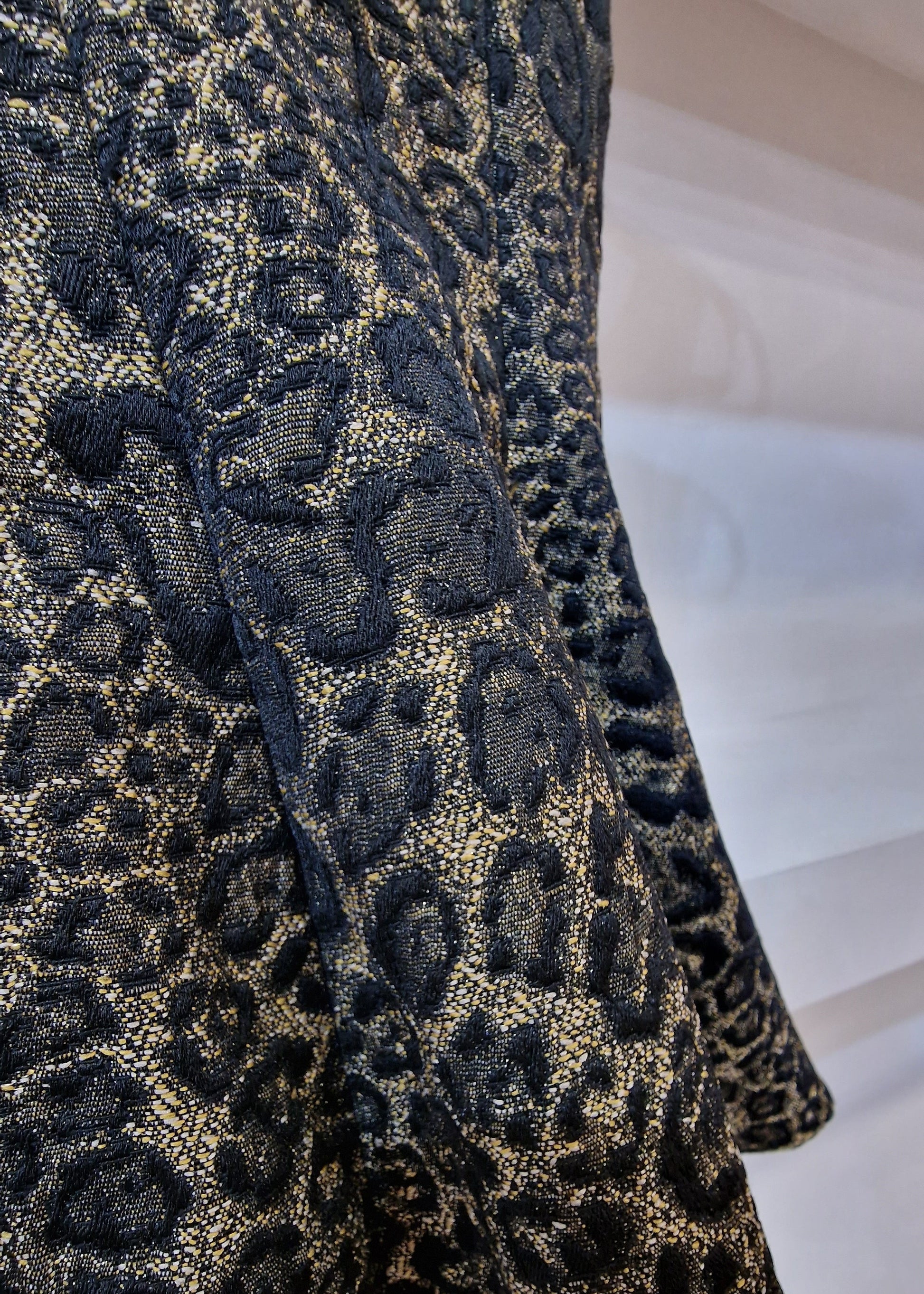Top em tecido jacquard 100% poliéster, com padrão inspirado no animal print, trabalhado em relevo e com fios de efeito dourado que conferem profundidade e sofisticação à peça. Apresenta decote redondo e cavas amplas, mantendo uma linha limpa e elegante na parte superior. A construção é ajustada na zona do tronco, abrindo ligeiramente a partir da cintura num efeito peplum suave, que valoriza a silhueta. O interior é totalmente forrado com forro acetinado, garantindo conforto e um melhor acabamento.