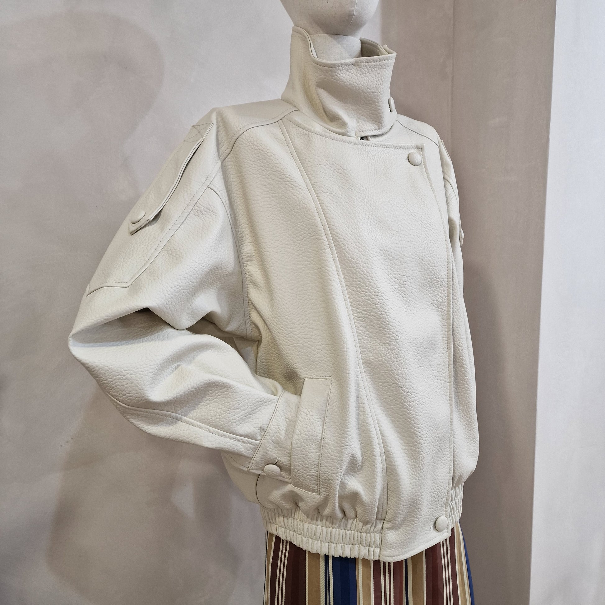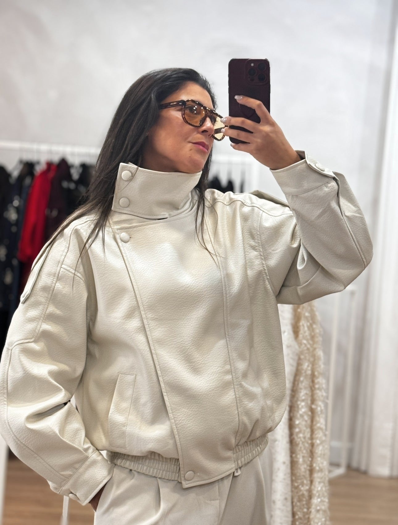 Casaco em couro sintético de textura suave, com corte bomber e gola alta estruturada. Possui fecho frontal escondido por lapela, bolsos laterais e acabamento com elásticos discretos na barra.