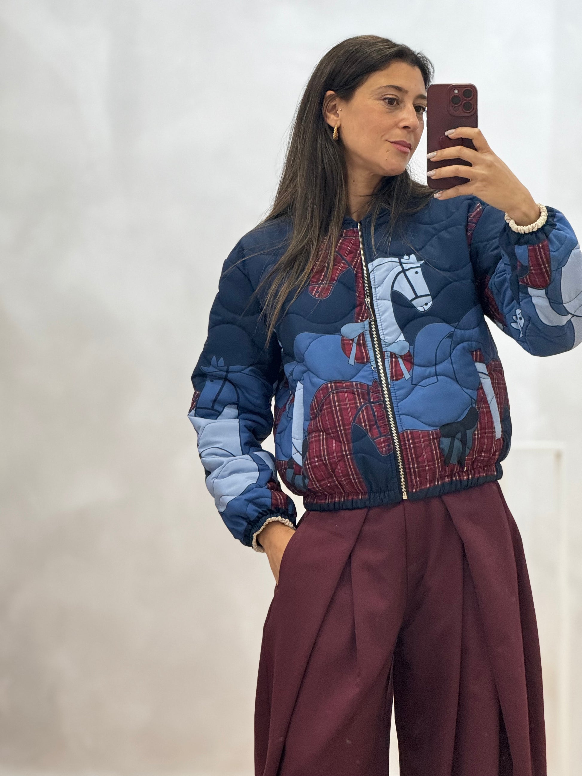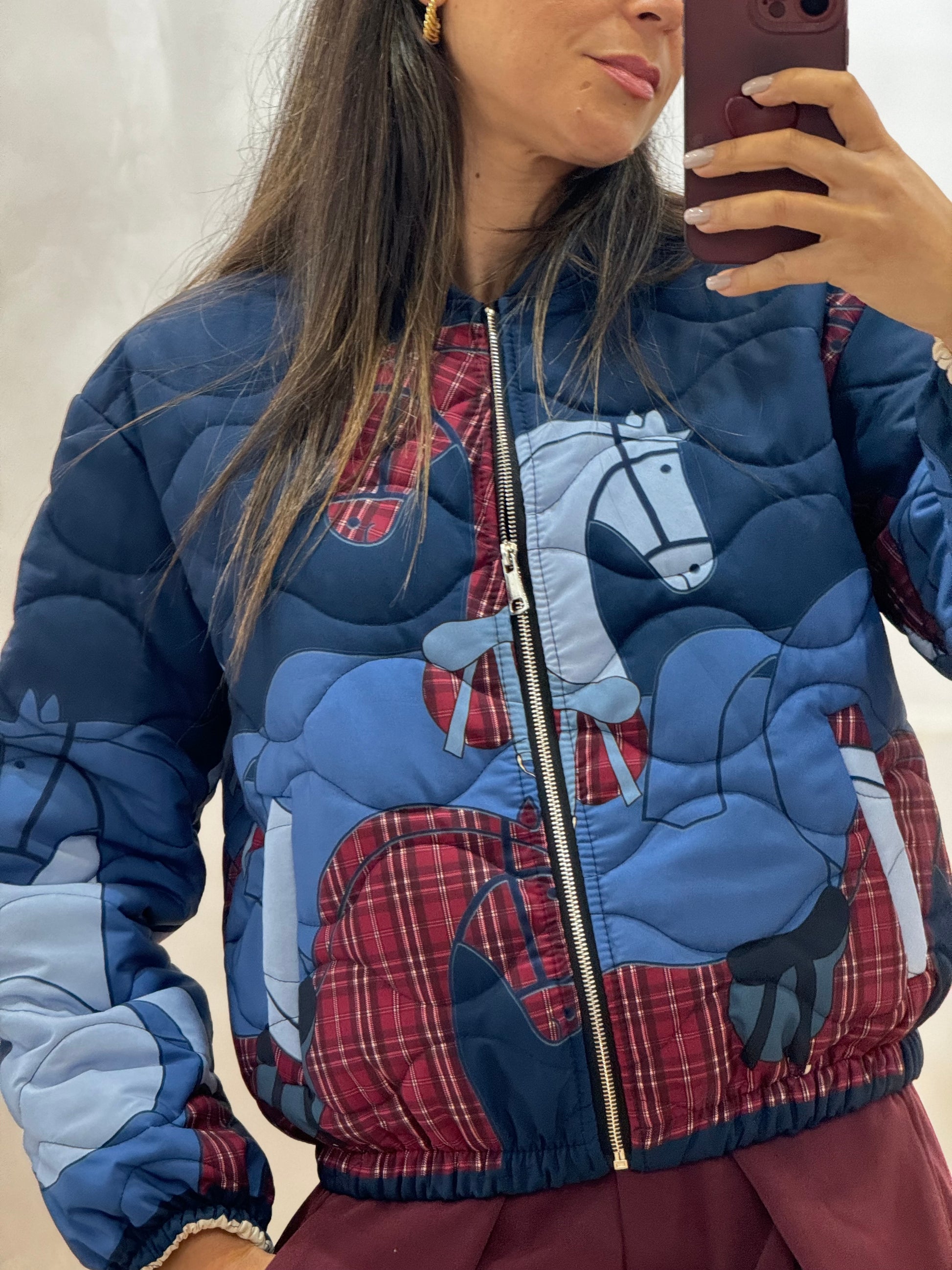 Casaco ligeiramente acolchoado com corte bomber. O acolchoado garante leveza e conforto, enquanto a estampa acrescenta carácter e originalidade à peça.