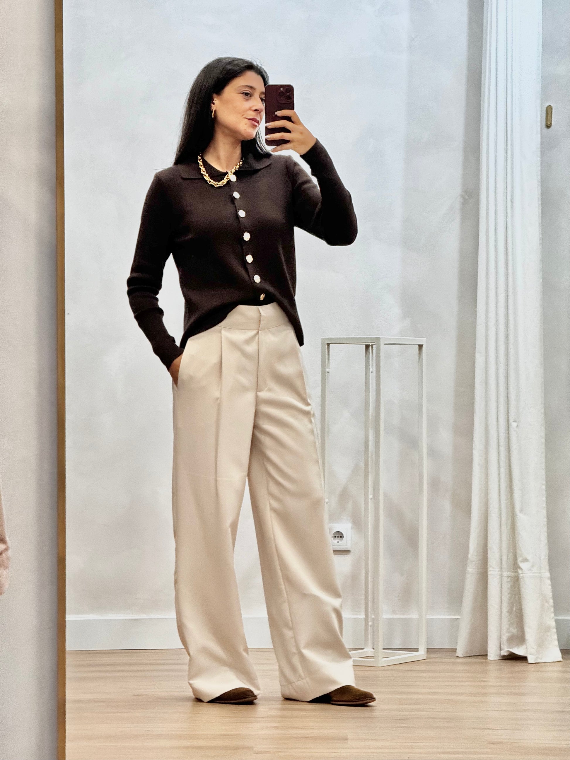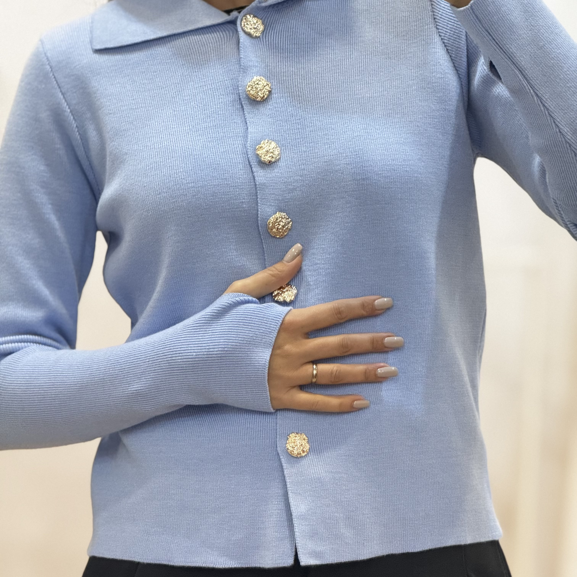 Cardigan de corte clássico, marcado pelo abotoamento frontal com botões decorativos que acrescentam elegância à peça. Trata-se de uma peça versátil para coordenados sofisticados do dia a dia.