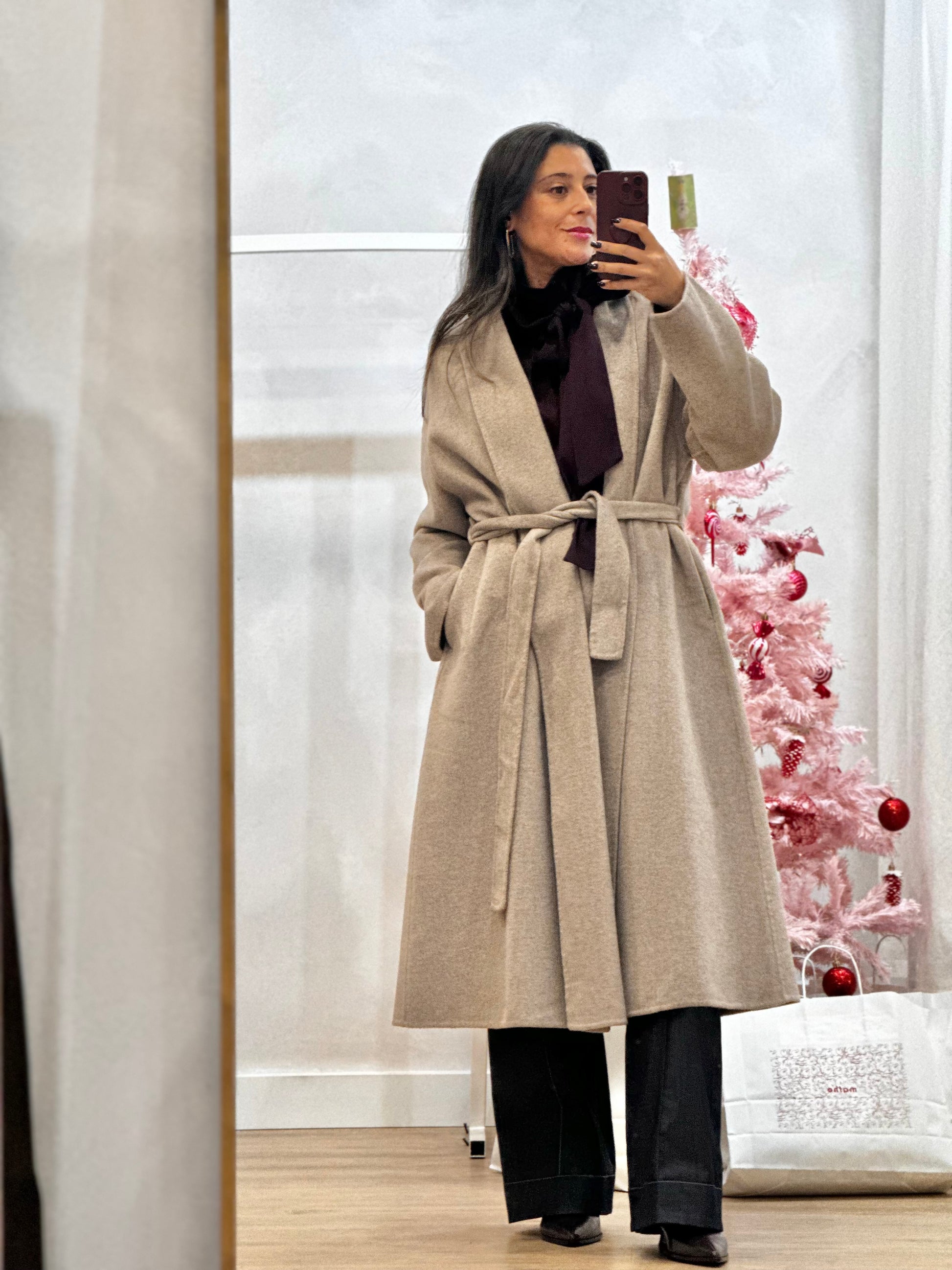 Casaco comprido em mistura de lã com corte reto, sem botões visíveis, apresentando gola ampla estruturada e mangas de construção solta. Silhueta minimalista e sofisticada.