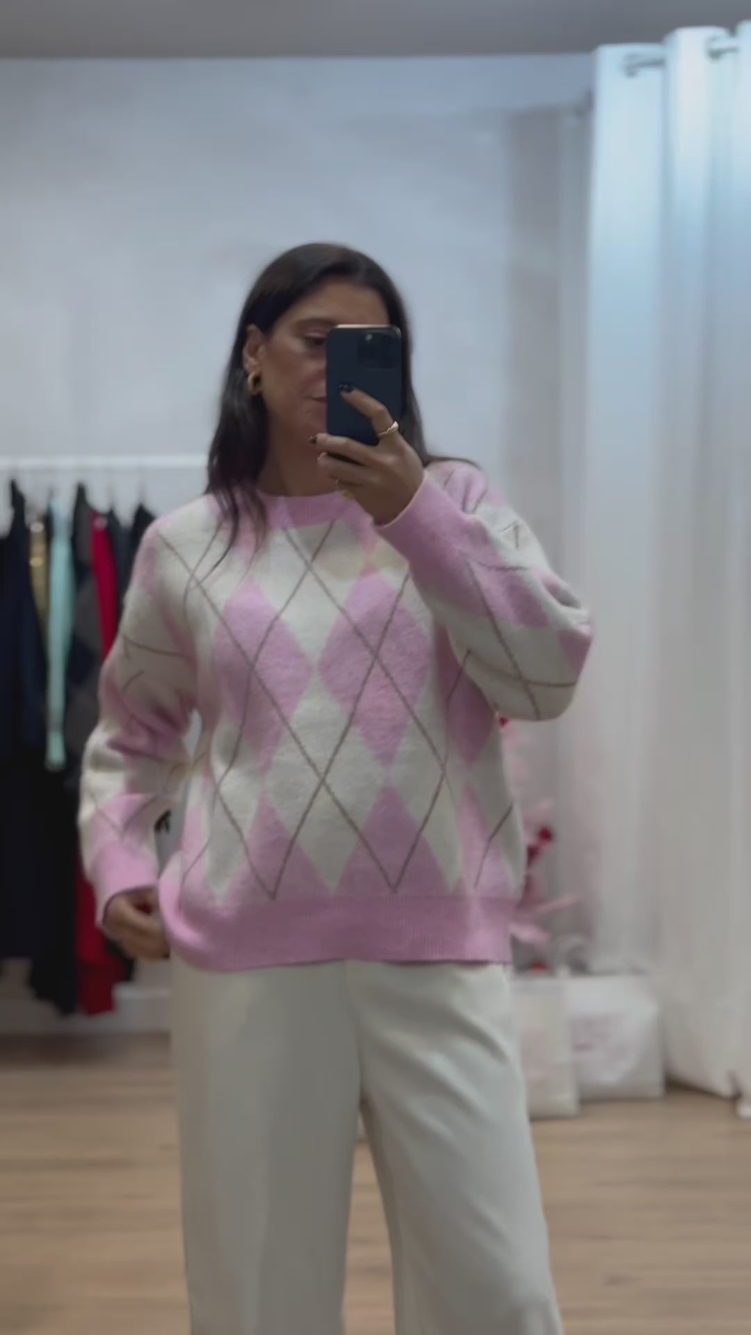 Detalhes essenciais: Padrão argyle (losangos), decote redondo, manga comprida, acabamentos canelados, toque macio