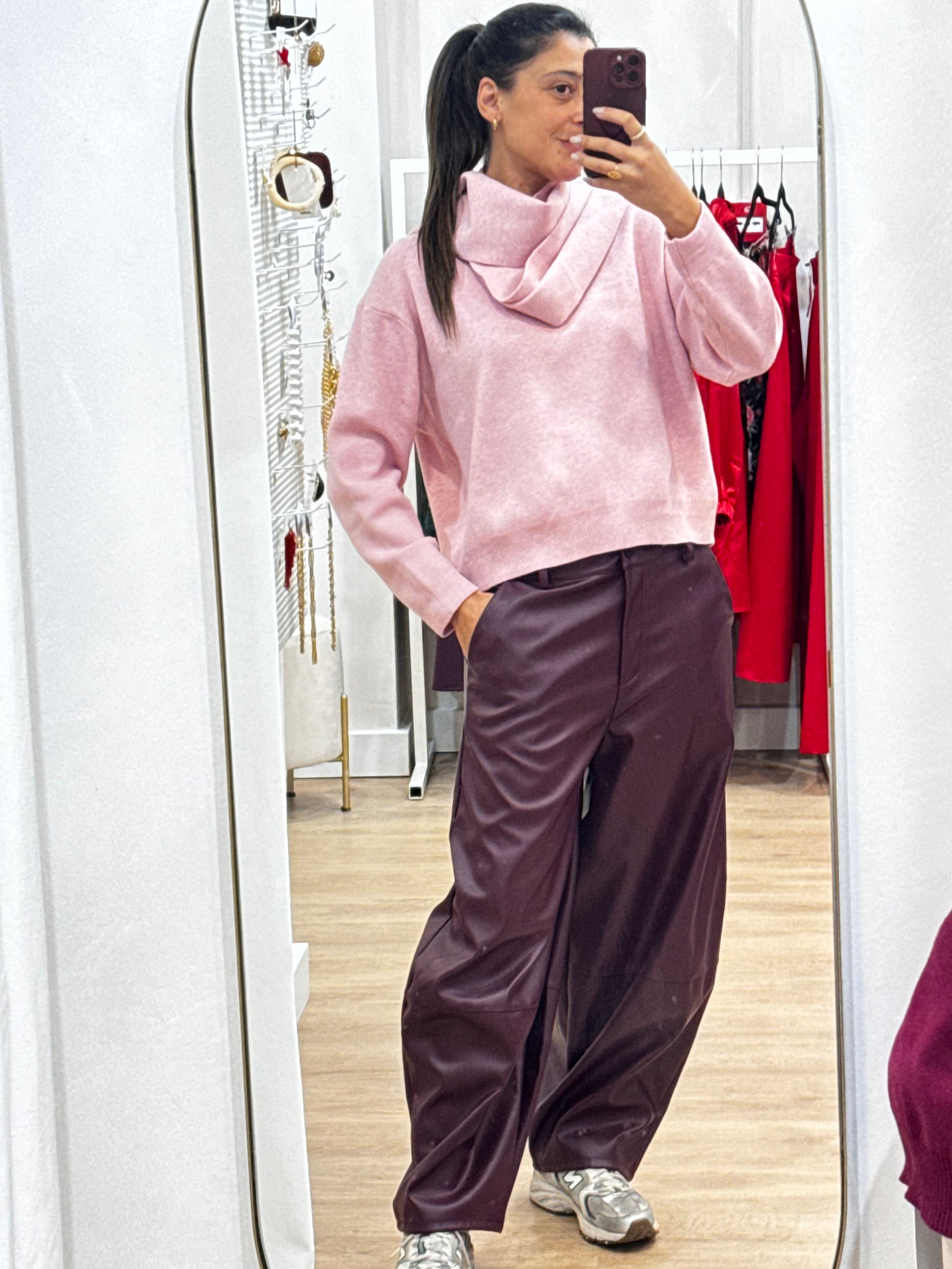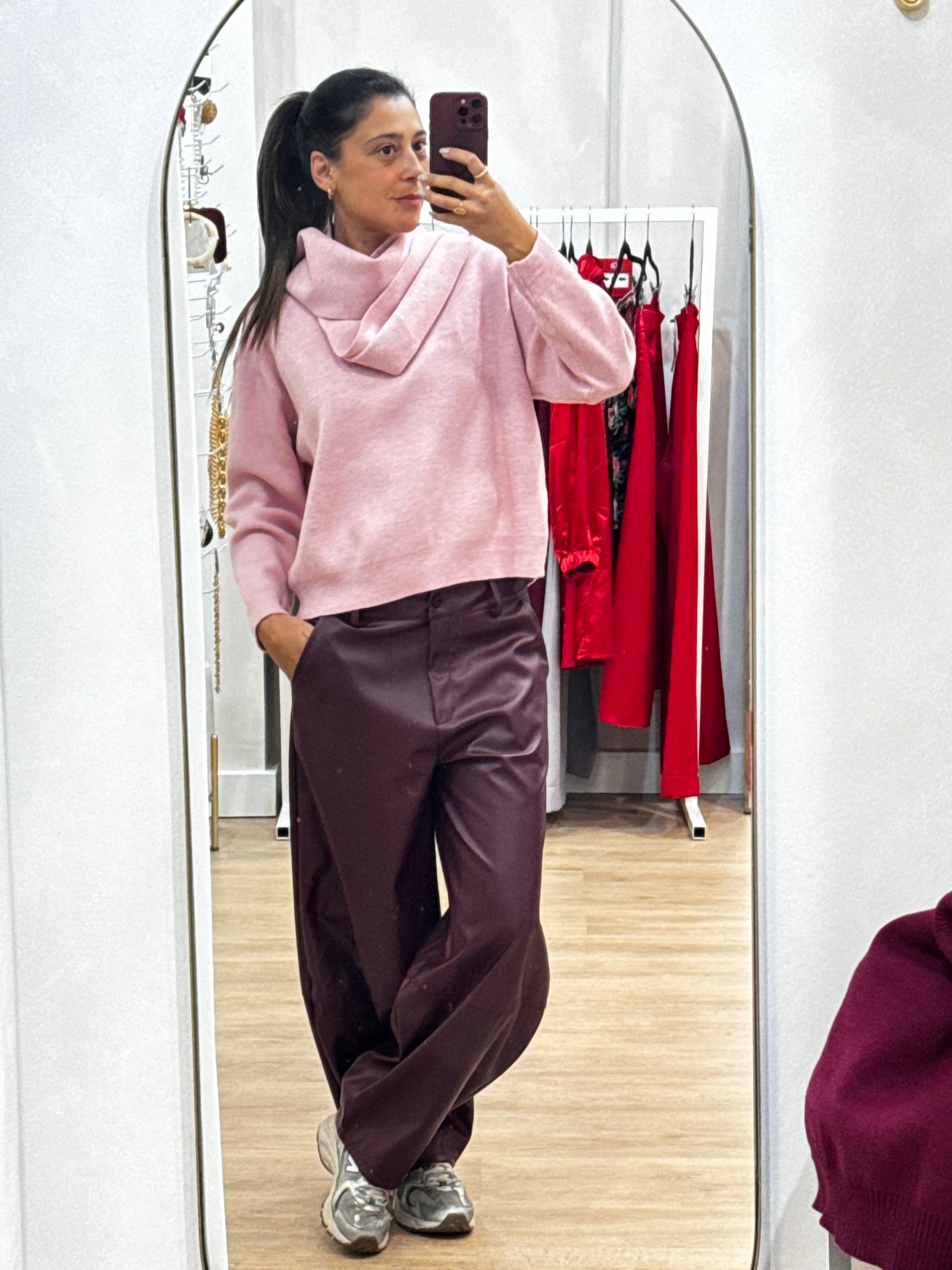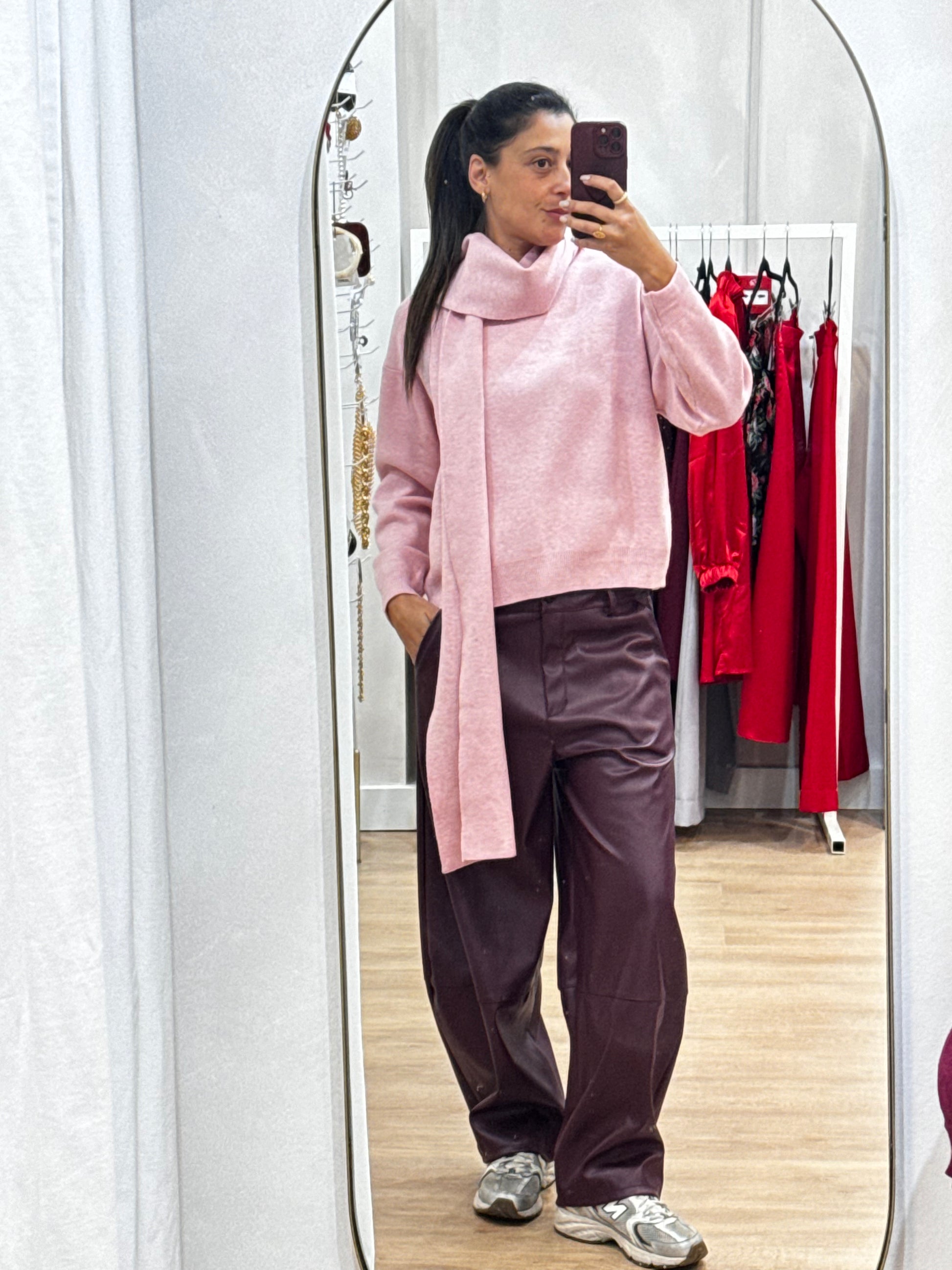 Camisola em malha, pensado para um visual delicado e contemporâneo. A camisola de linhas simples tem acoplada uma echarpe integrada no mesmo material, criando um efeito harmonioso e elegante. O toque suave e o caimento confortável tornam a peça ideal para um uso diário com sofisticação discreta.