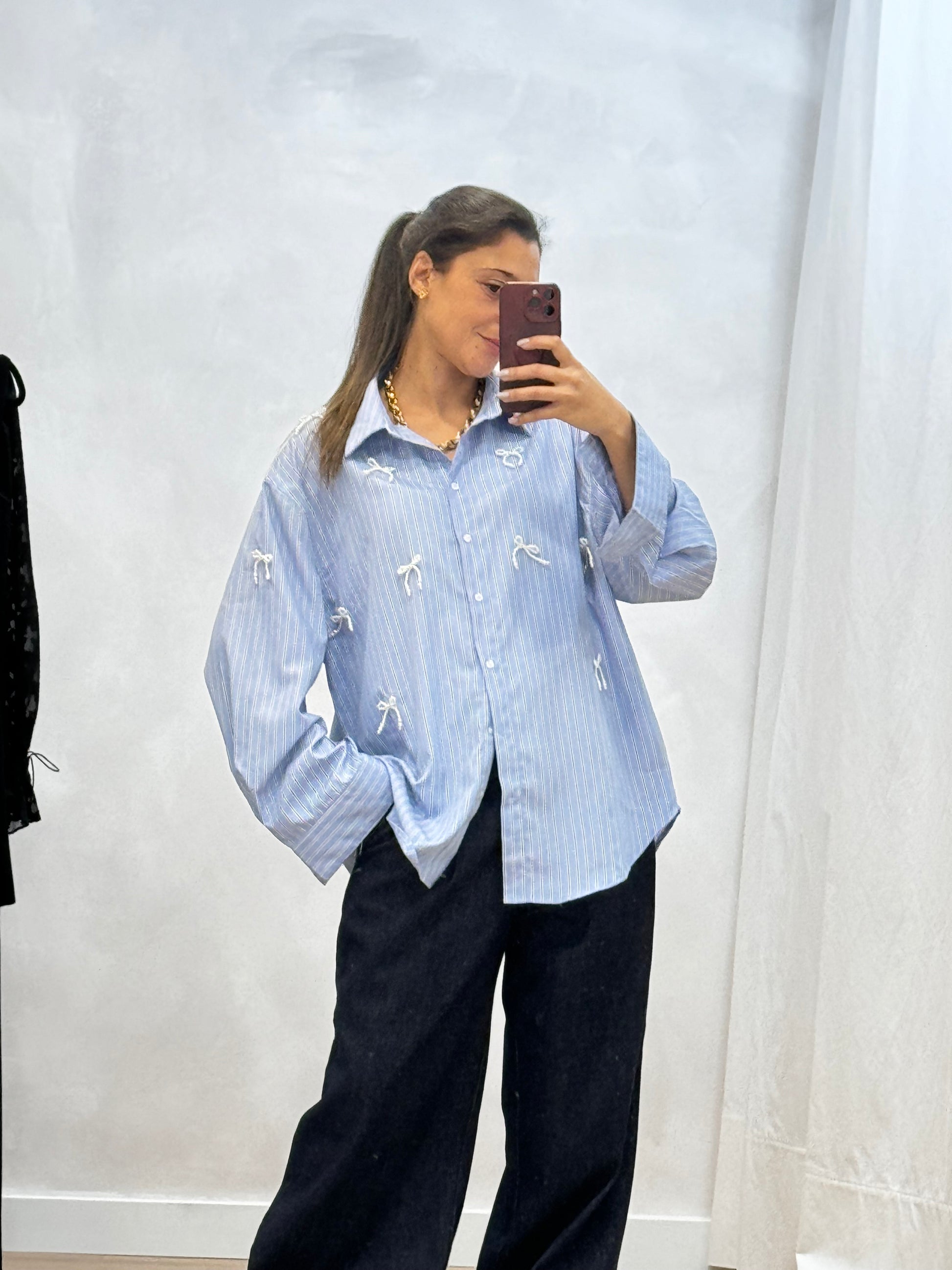 Camisa oversize de corte clássico, marcada por riscas finas verticais que alongam visualmente a silhueta. O corte amplo garante um caimento descontraído e confortável, enquanto os laços decorativos com missangas acrescentam um detalhe delicado e feminino, elevando a peça com um toque subtilmente sofisticado.