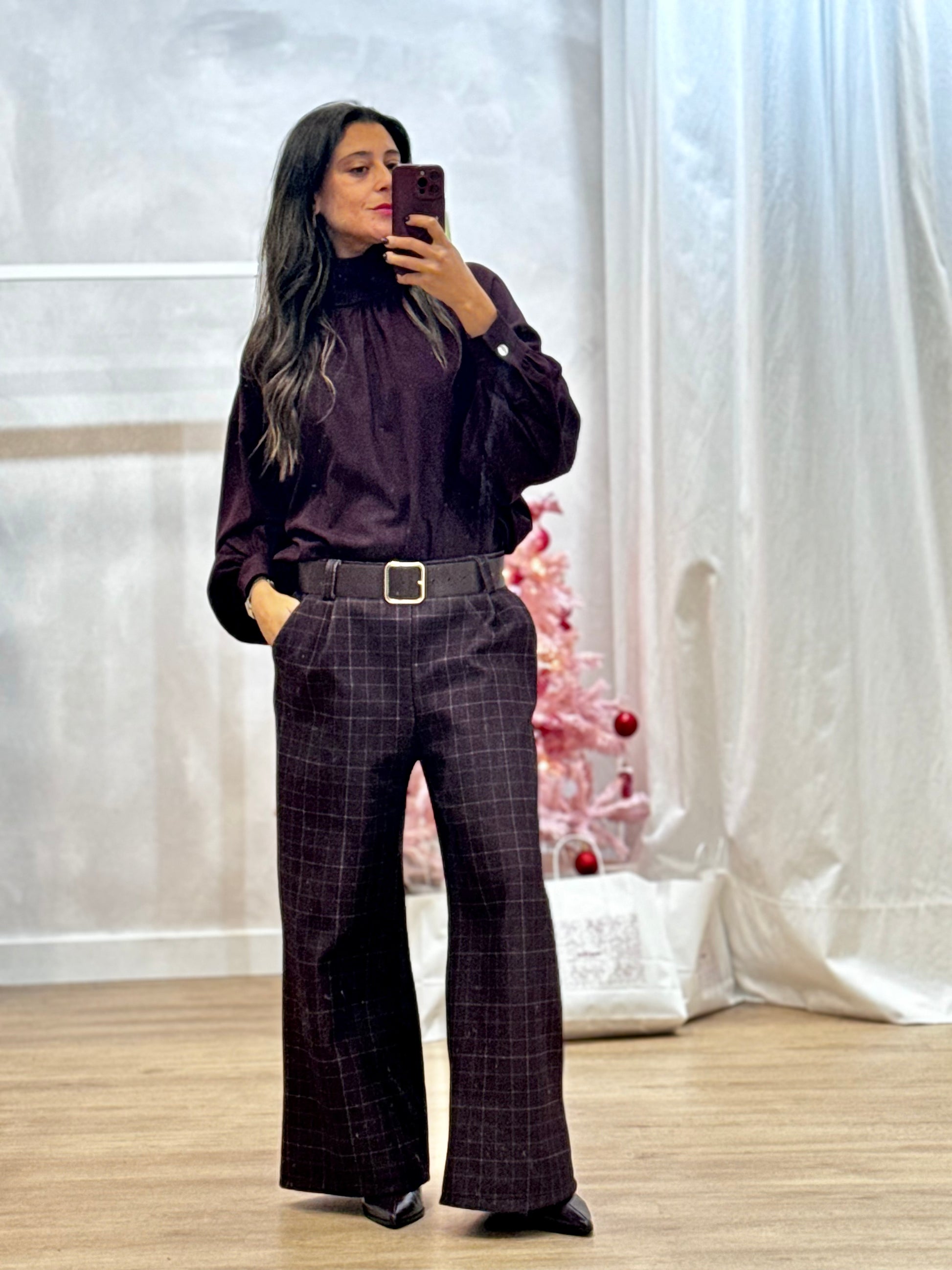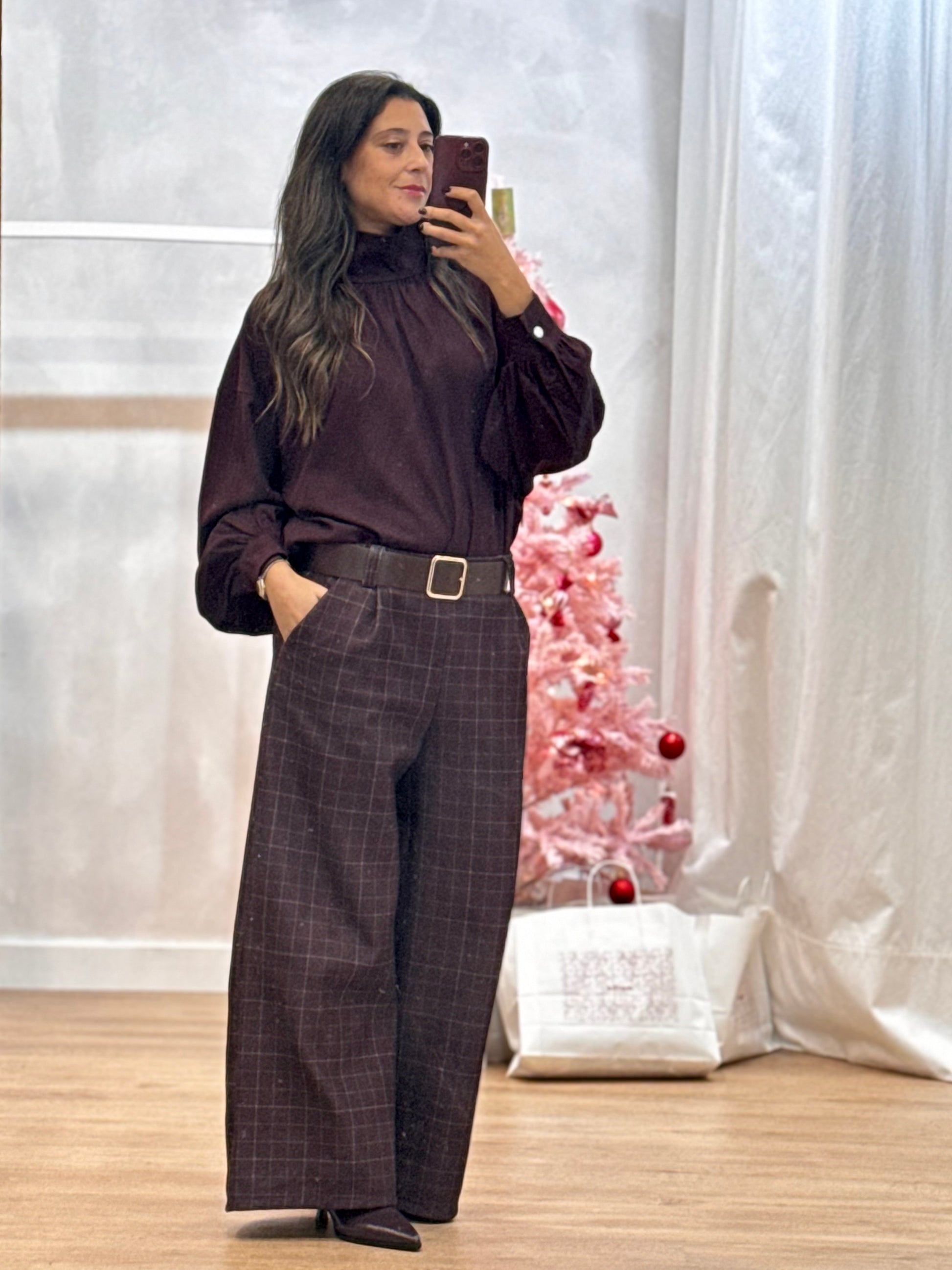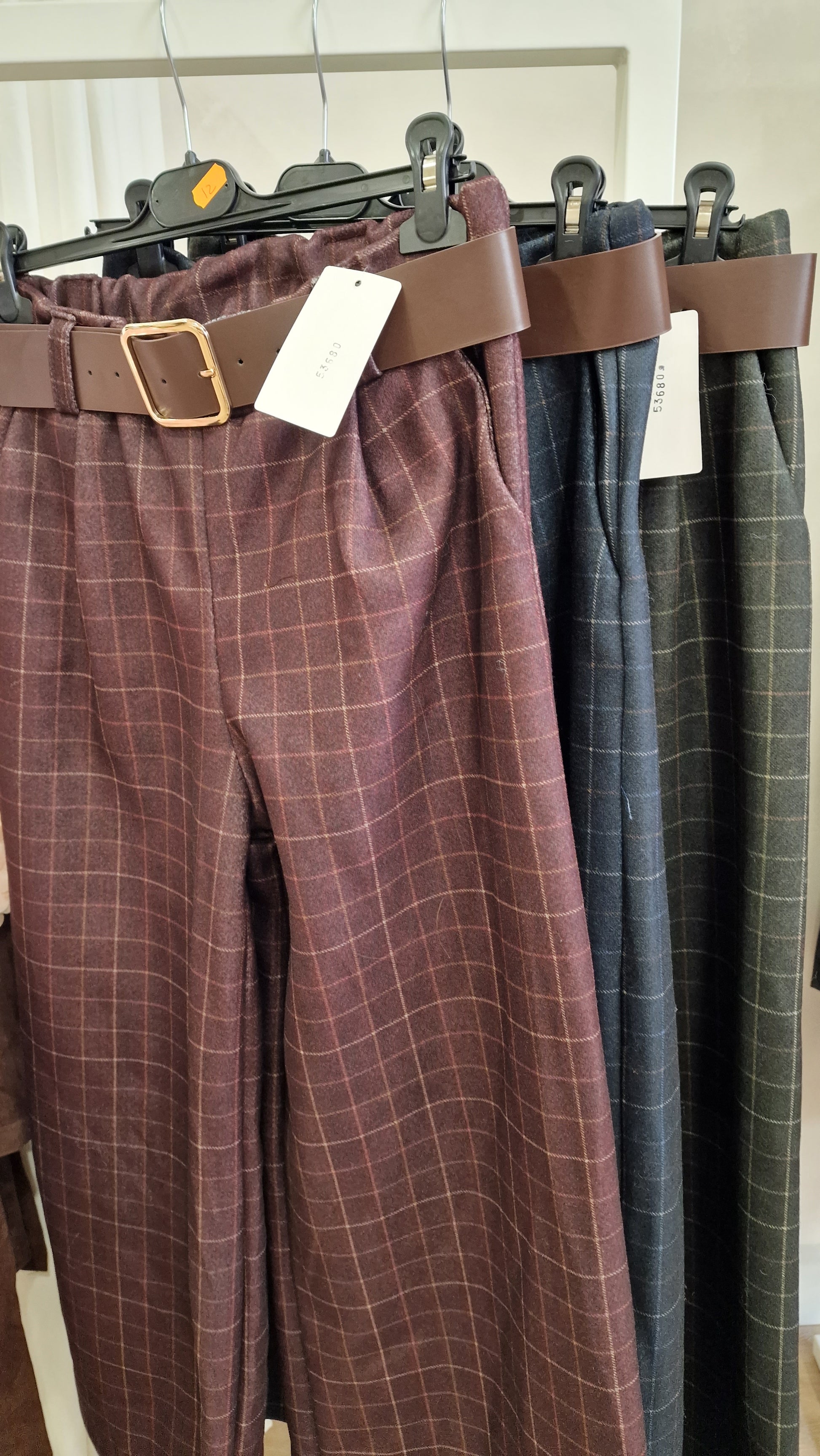 Calças retas em tecido leve com padrão aos quadrados, cintura subida com cós elástico e cinto integrado. Estrutura confortável e elegante.