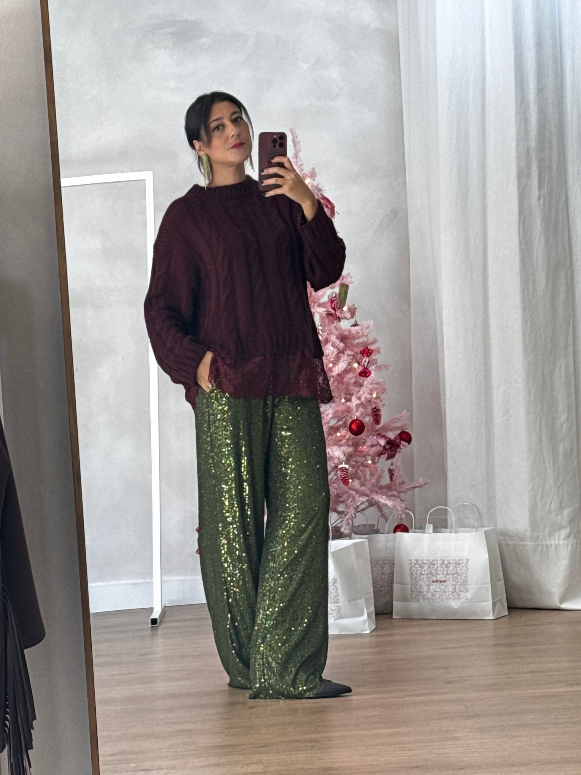 Detalhes essenciais: Lantejoulas aplicadas na vertical, acabamento brilhante, perna larga