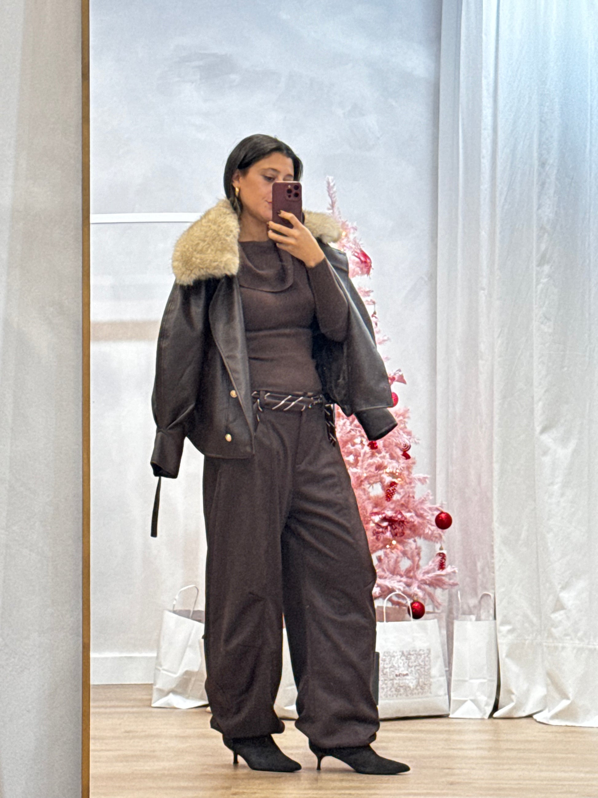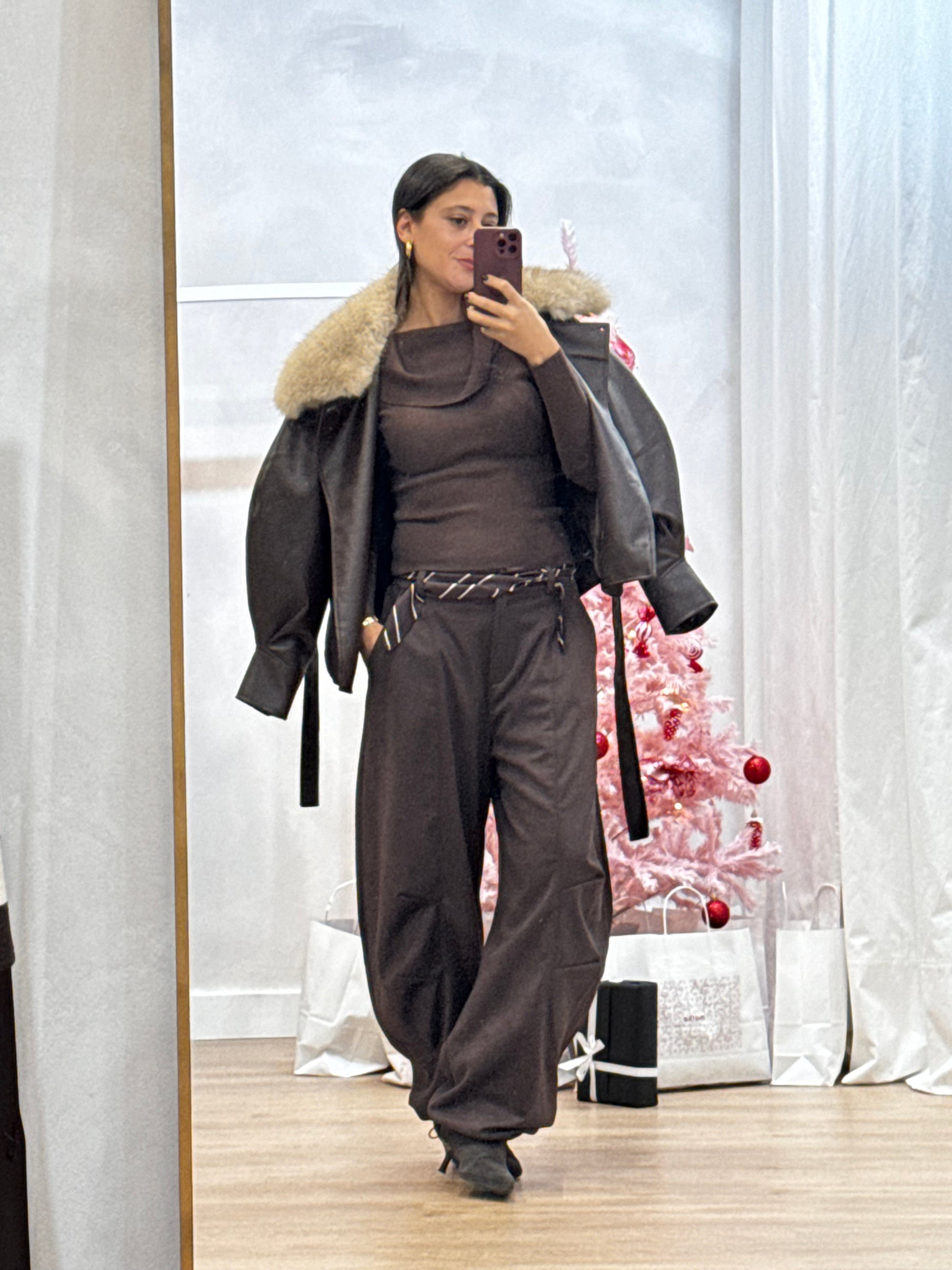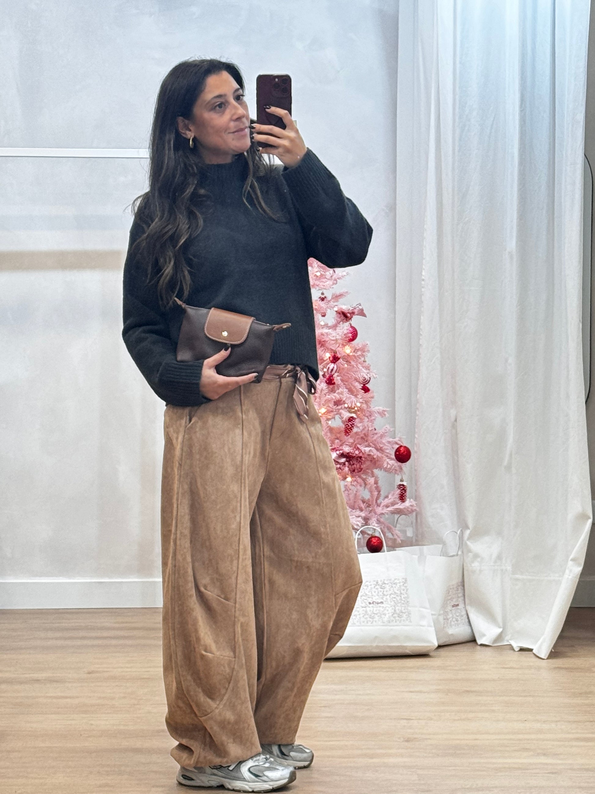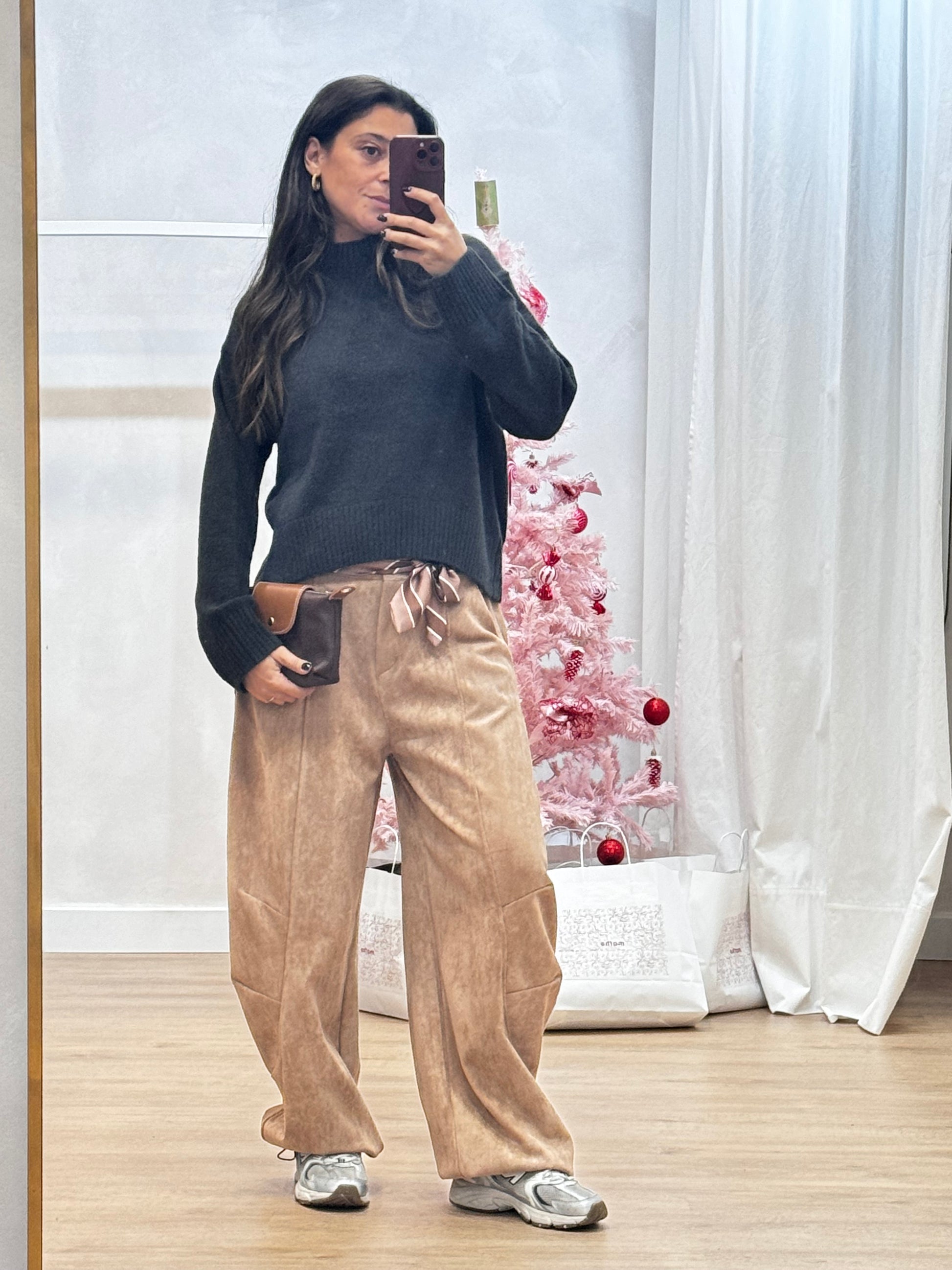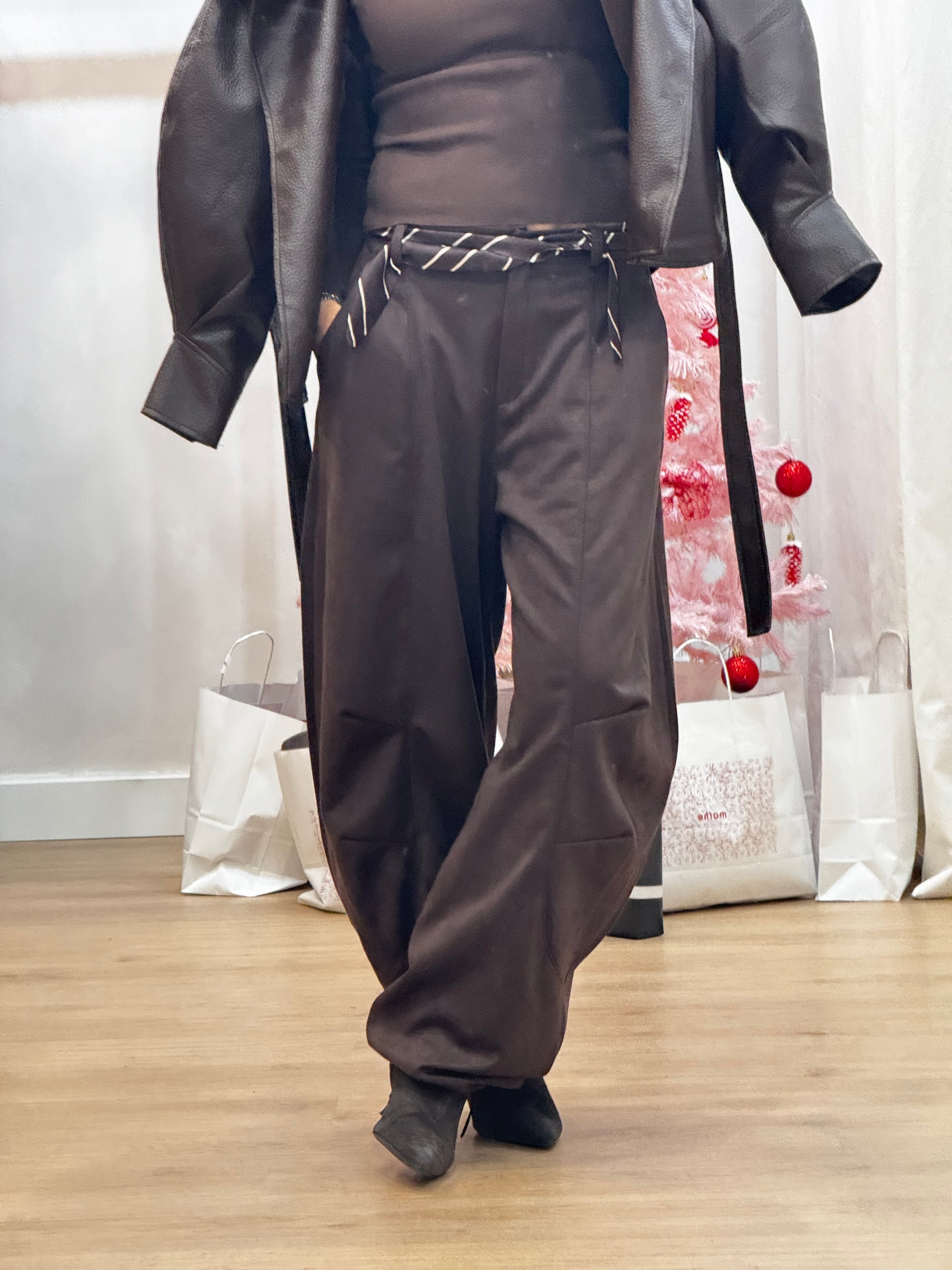 Fitting: Wide leg, cintura média-alta, caimento fluido