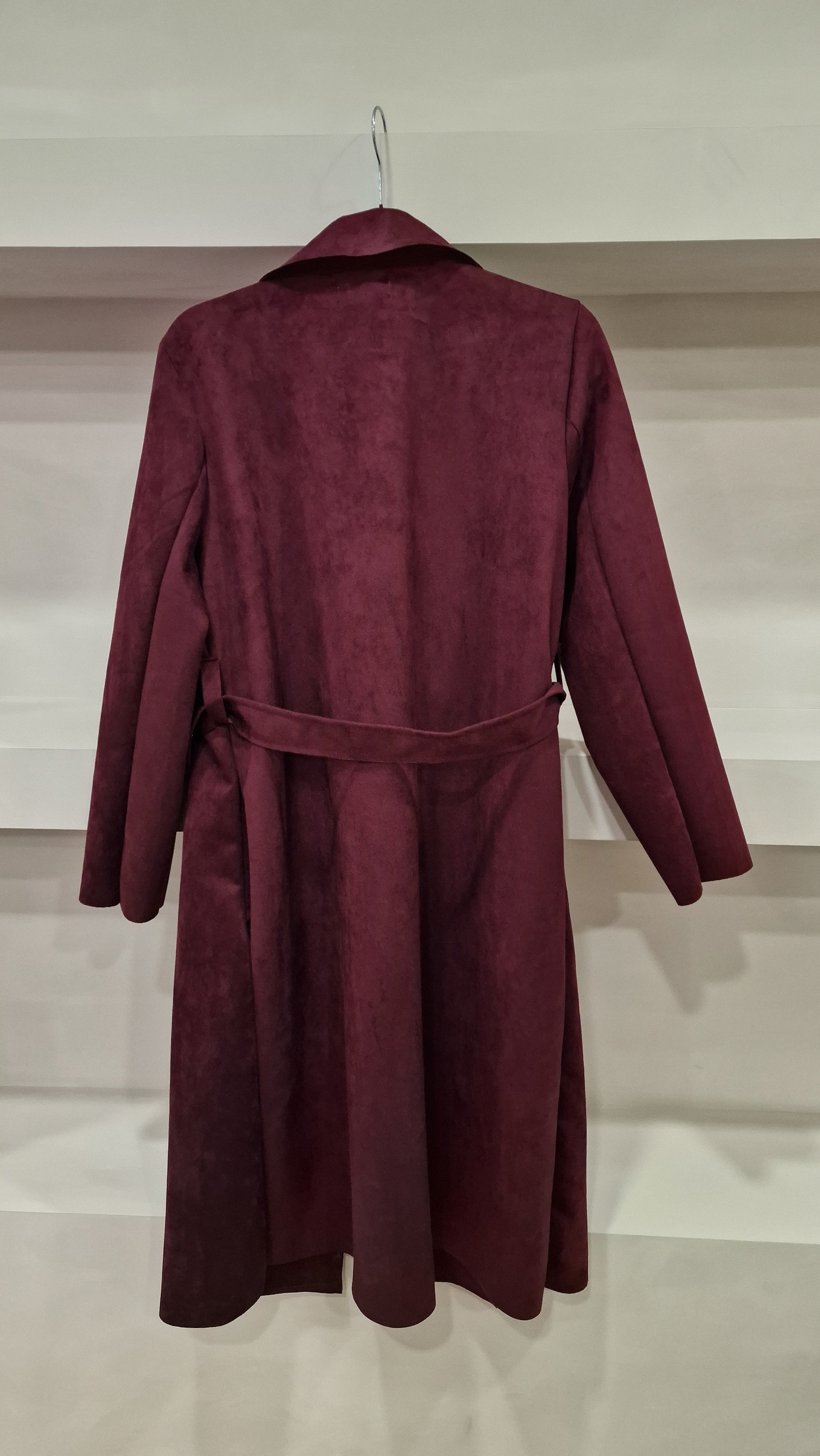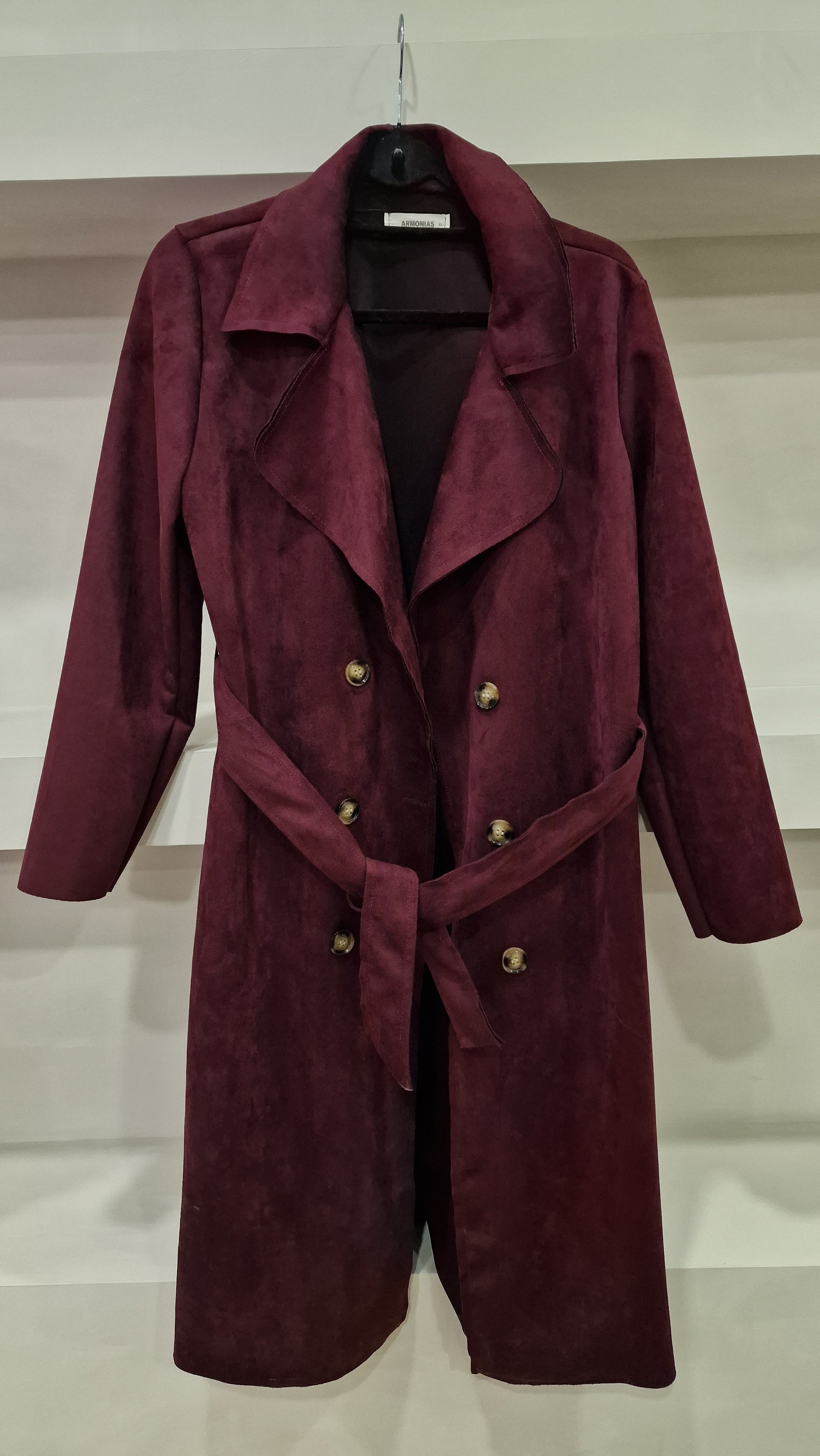 Gabardine estilo trench coat com caimento fluido e toque aveludado, apresentando botões duplos frontais e cinto ajustável. Corte reto e gola ampla estruturada.