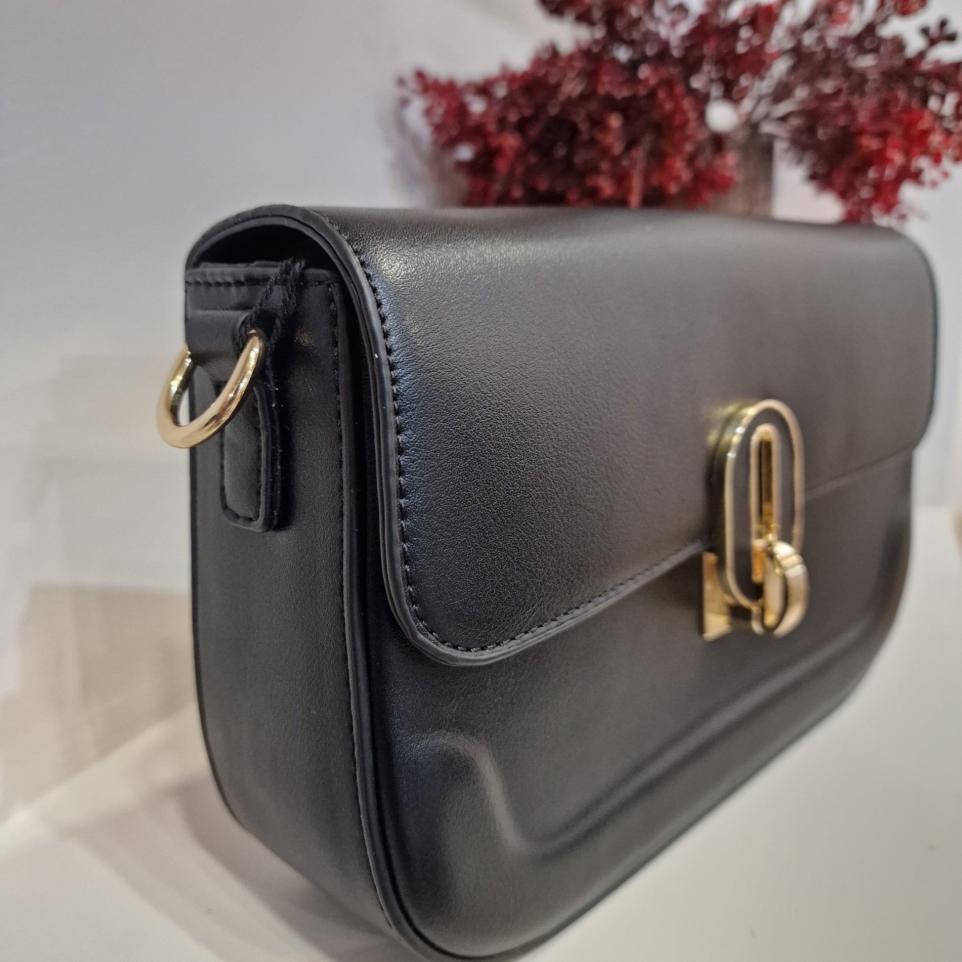 Detalhes essenciais: Aba frontal com fecho metálico dourado, alça ajustável e removível, linhas minimalistas, formato rectangular estruturado