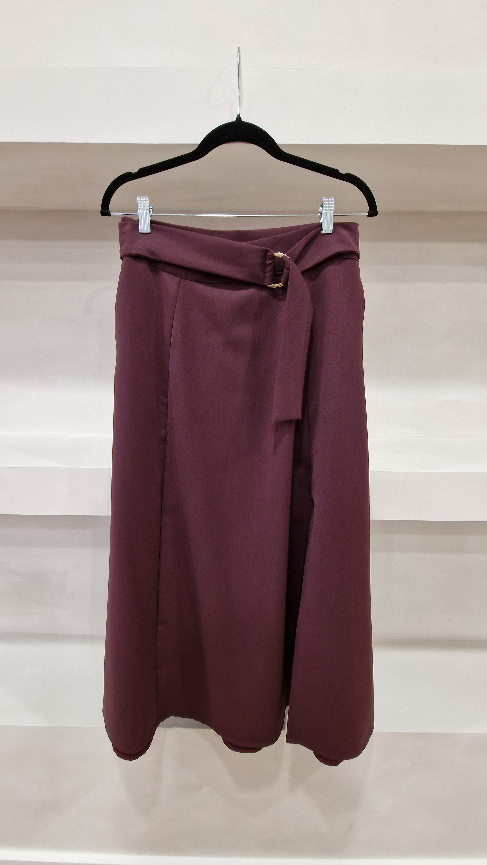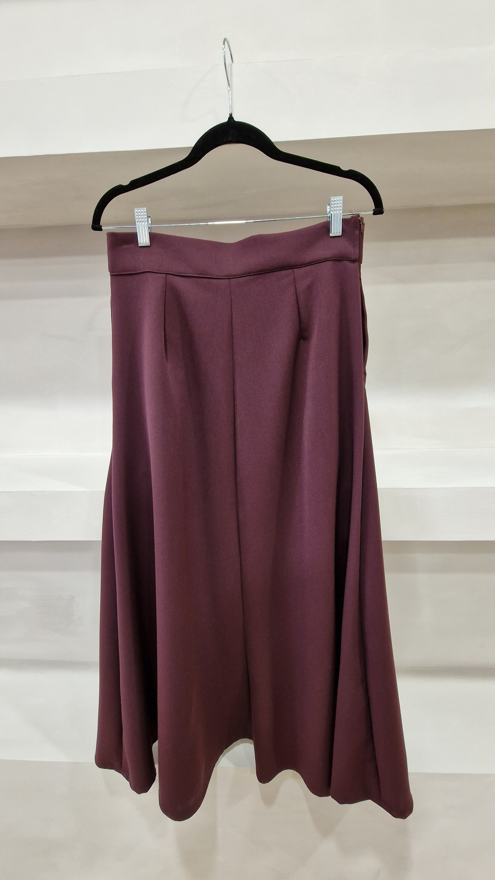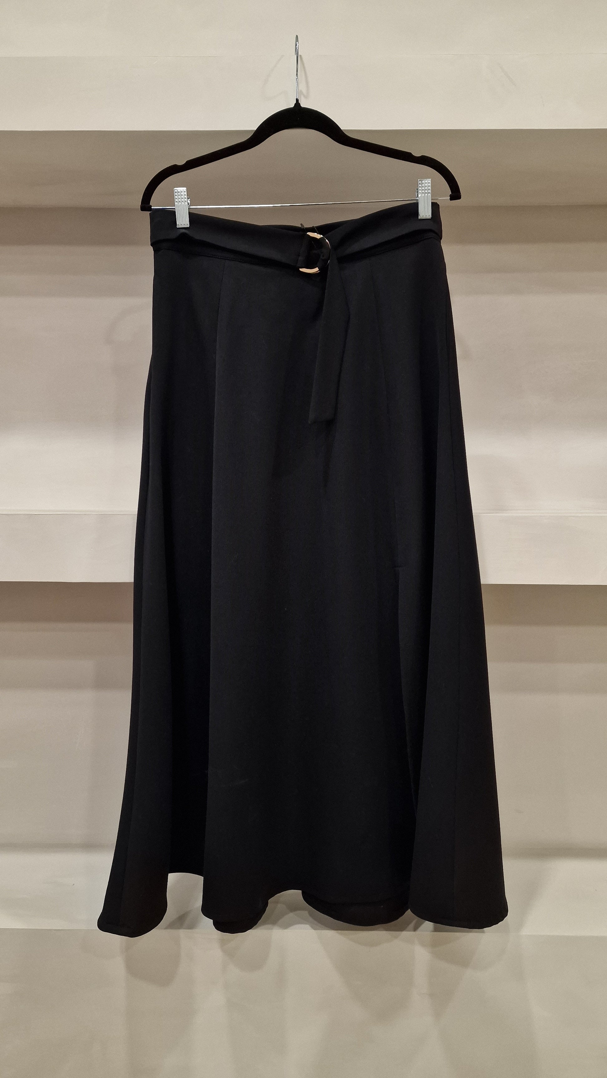 Saia midi em malha tecida fluida de tom verde tropa, com corte godê, fenda frontal e cintura média com laço integrado. Estrutura suave com movimento natural.
