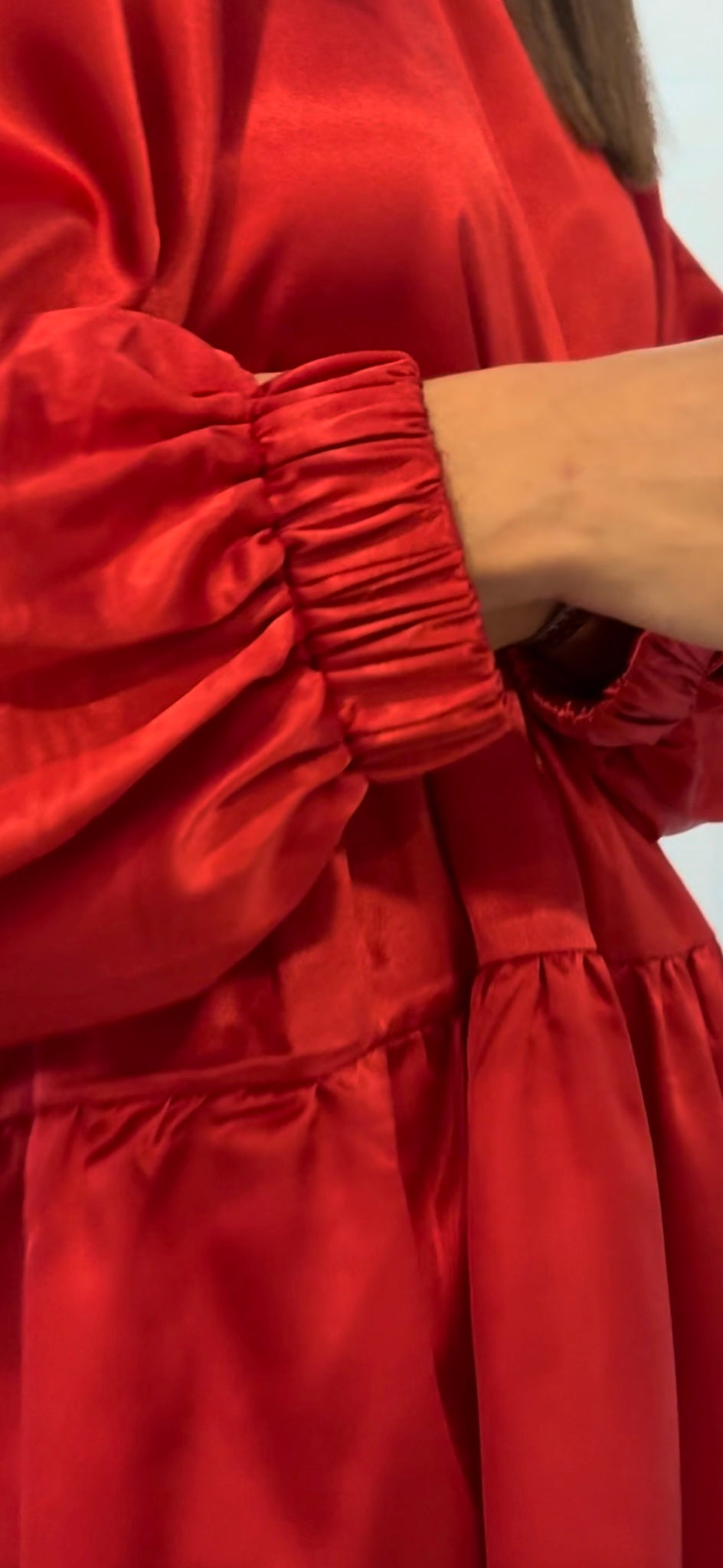 Vestido curto em tecido acetinado vermelho, com estrutura leve e acabamento brilhante. Mangas longas com punho elástico e interior forrado.