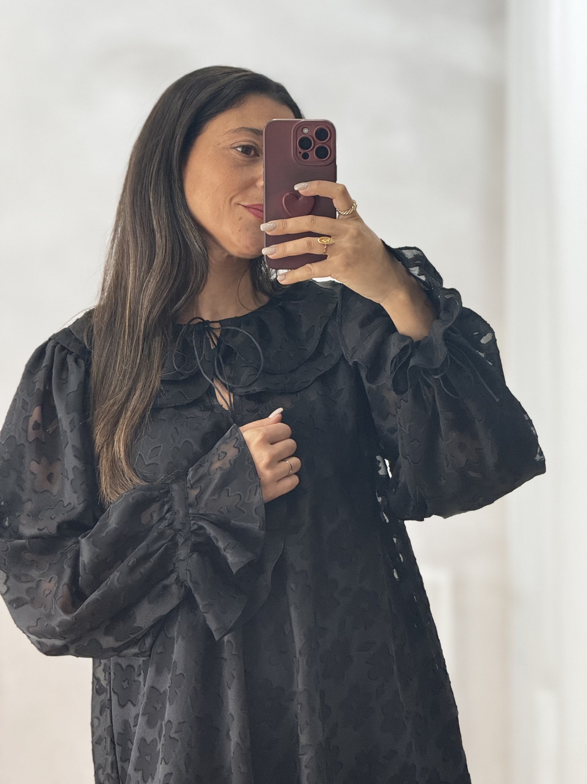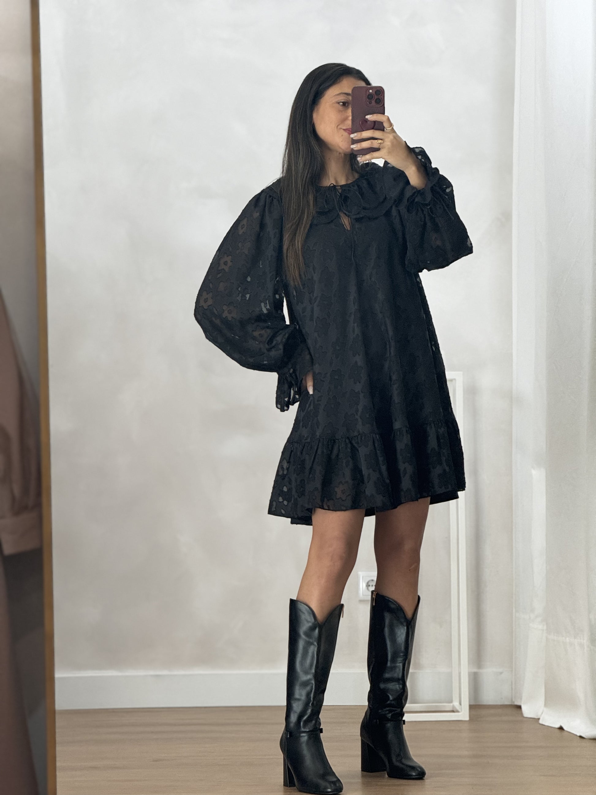 Vestido curto em tecido translúcido texturado com motivos florais opacos, acabamento fluido e mangas largas com punho elástico e gola dupla com laço discreto no decote. Inclui vestido interior liso.
